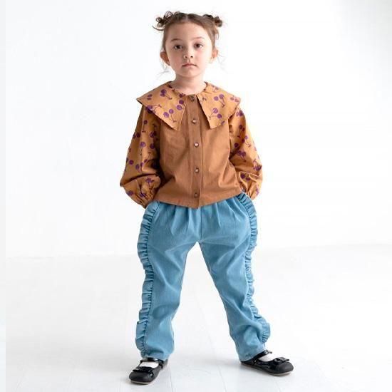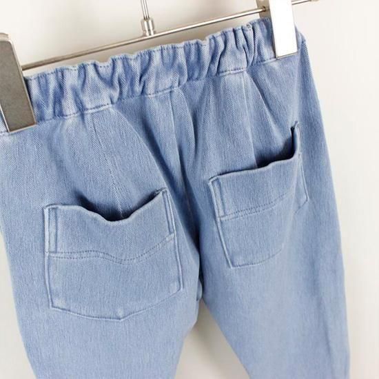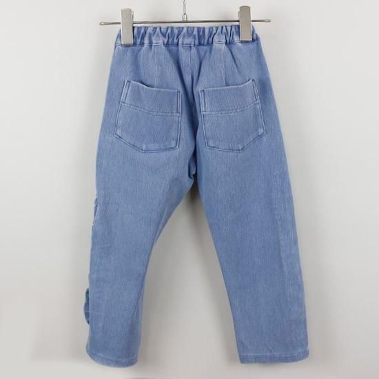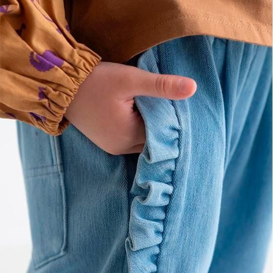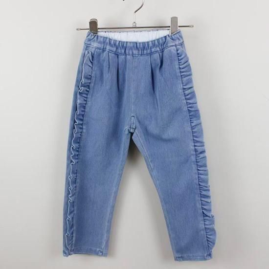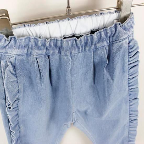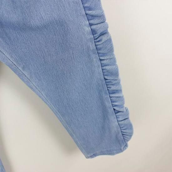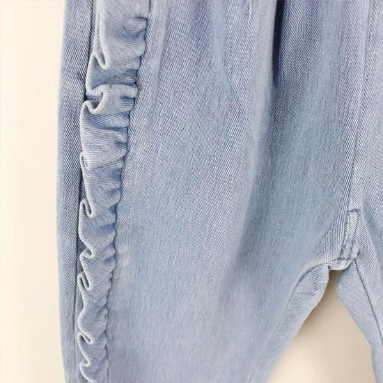 柔らかく伸びのあるブリーチデニムニットでできた、フリルロングパンツ。
