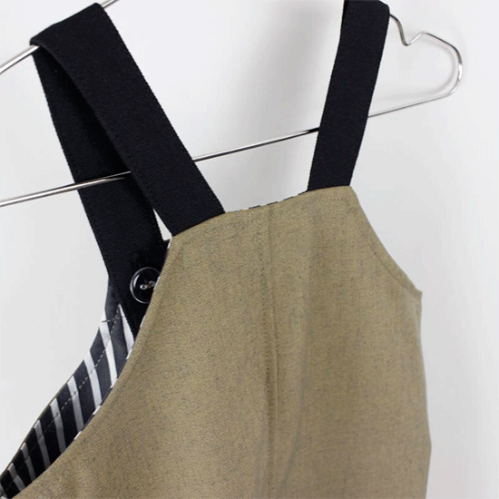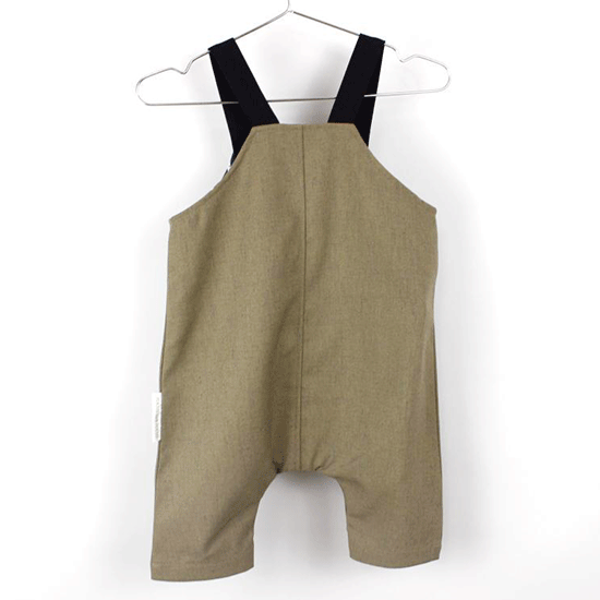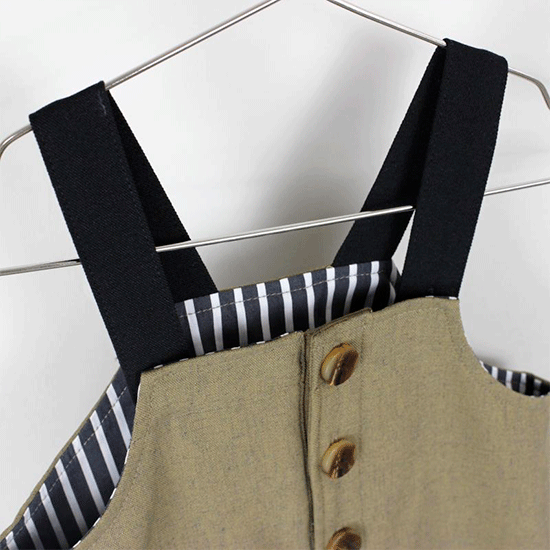 上品な光沢感の杢ツイルと肩紐を配色でポイントにしたベビーサロペットです。