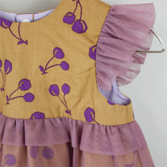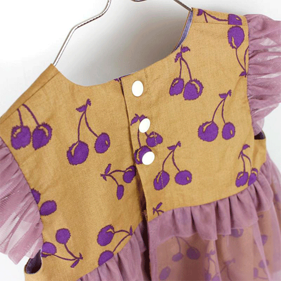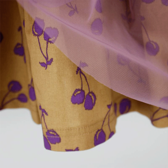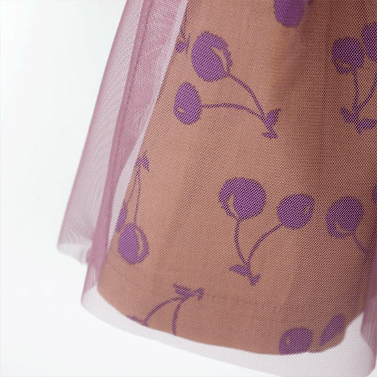 繊細なフラワー柄にピンクのチュールのコンビネーションがかわいい黒系とチェリー柄にパープルのチュールが大人っぽいキャメル系。