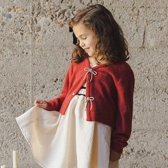 ボウカーディガンは、クラシックなニット素材にフロントの繊細なリボンディテールを施した、可愛らしい重ね着アイテムです。快適さと可愛らしさを兼ね備えたデザインで、ホリデードレスとの相性も抜群。一枚で着ても、温かみのあるステートメントピースとして活躍します。