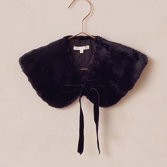 エロイーズカラーは、隠しスナップ留めと、フロント中央にあしらわれたベルベットリボンが特徴です。このチャーミングなフルカラーは、この季節にお子様を暖かく保つための完璧なアクセサリーです。 「ブラック」カラーが特徴です。