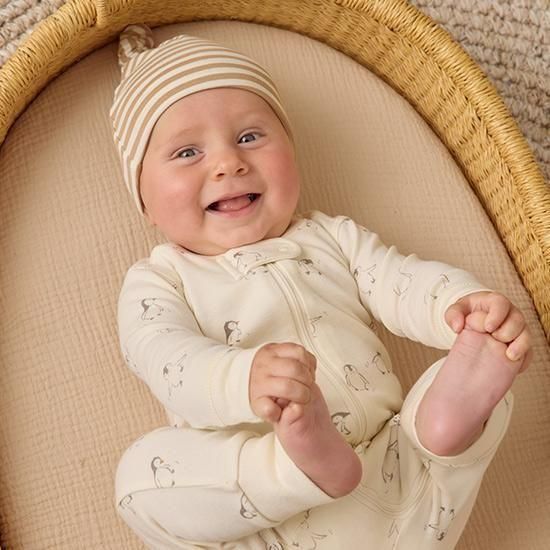 柔らかく伸縮性のある起毛ジャージー素材を使用した、心地よいフィット感の結び目付きベビーハットです。